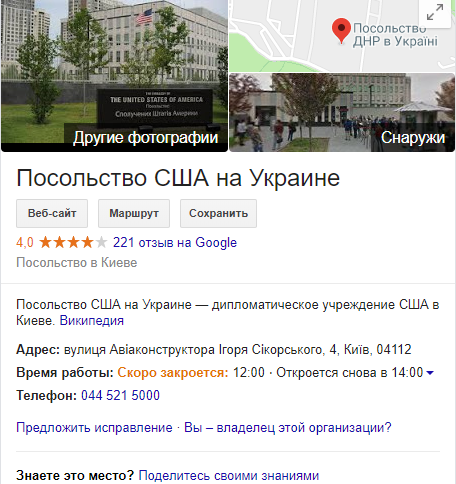 Так, при запросе "посольство США в Киеве" в Google в правом углу страницы появляется короткая информация о ведомстве и часть карты, на которой посольство США подписано как "посольство "ДНР".