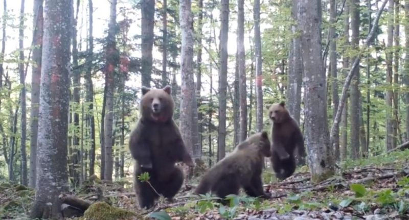 Мама-медведица и трое медвежат обосновались на поляне, но внезапно услышали шум.