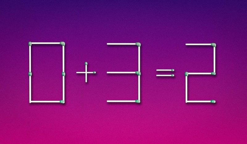Ниже вы увидите изображение, где с помощью спичек выложено равенство 0+3=2. С математической точки зрения оно неверно. Вам нужно исправить ошибку, переставив всего одну спичку.