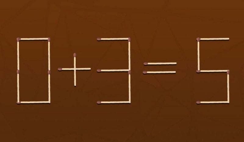 На изображении ниже вы увидите равенство 0+3=5, выложенное с помощью спичек. Здесь есть ошибка, ведь ответ должен был бы равняться 3.