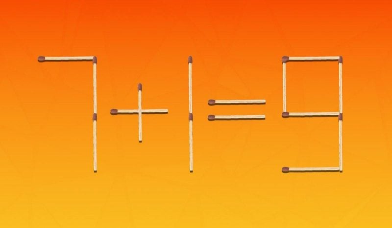 Ниже вы увидите изображение, где спичками выложено равенство 7+1=9. Очевидно, что оно математически неправильное, и вам нужно это исправить, переместив только две спички из 15.
