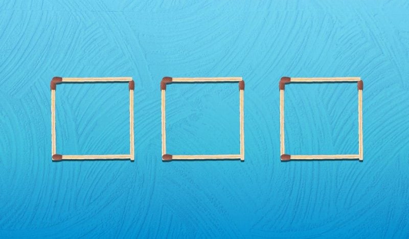 Это задание проверит ваше логическое мышление. Ниже вы увидите коллаж, где спичками выложены три одинаковых квадрата. Всего использовано 12 спичек.