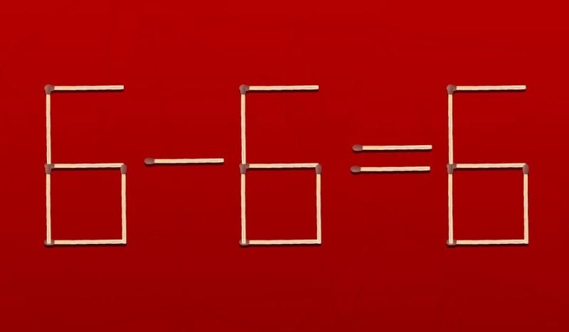 Как видим, решение этой головоломки довольно простое: нужно переложить среднюю спичку в последней цифре 6, изменив ее на 0. Получится правильное равенство: 6 - 6 = 0.
