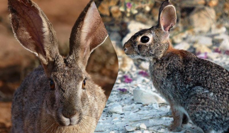 По цвету зайцы имеют серовато-рыжую шерсть со светлым брюхом, янтарные глаза, белые хвосты с черными кончиками и длинные уши с черными кончиками. Кролики имеют более серо-коричневый цвет, более короткие уши, темно-карие глаза и пушистый белый хвост, похожий на ватный шарик, который вы обычно видите, когда они бегут в свою нору.