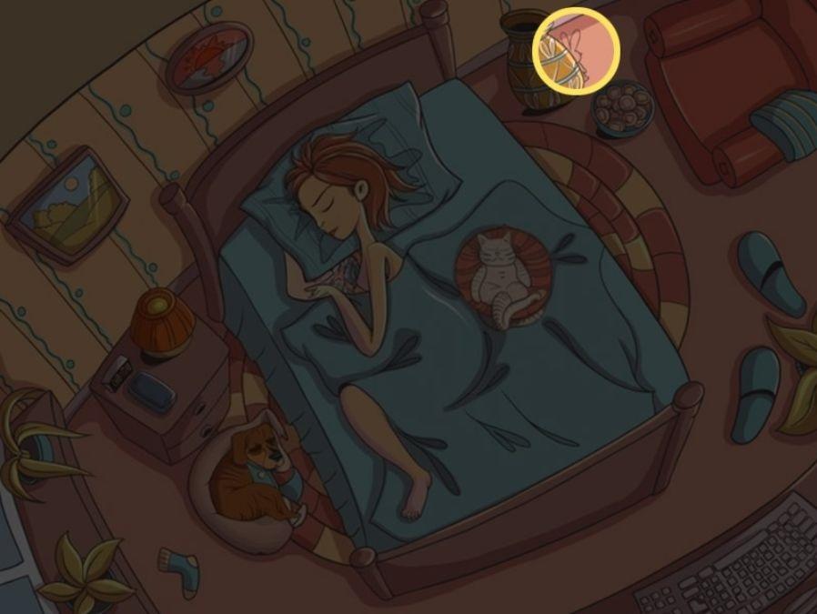 Вам предложено изображение, на котором можно увидеть мальчика, спящего в своей уютной комнате. Рядом с ним также спят кошка и собака. Но кроме них в этой комнате также прячется зайчик.