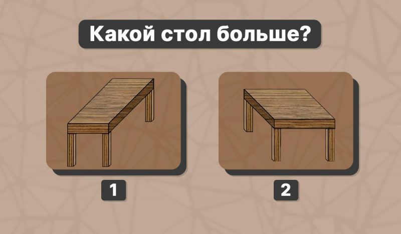 Оптические иллюзии умело обманывают наш мозг и искажают восприятие. Очень трудно не дать себя обмануть такому трюку. Однако люди с высоким интеллектом могут легко найти подвох. Если хотите проверить себя, вам точно понравится эта оптическая иллюзия - какой стол больше из предложенных на картинке.