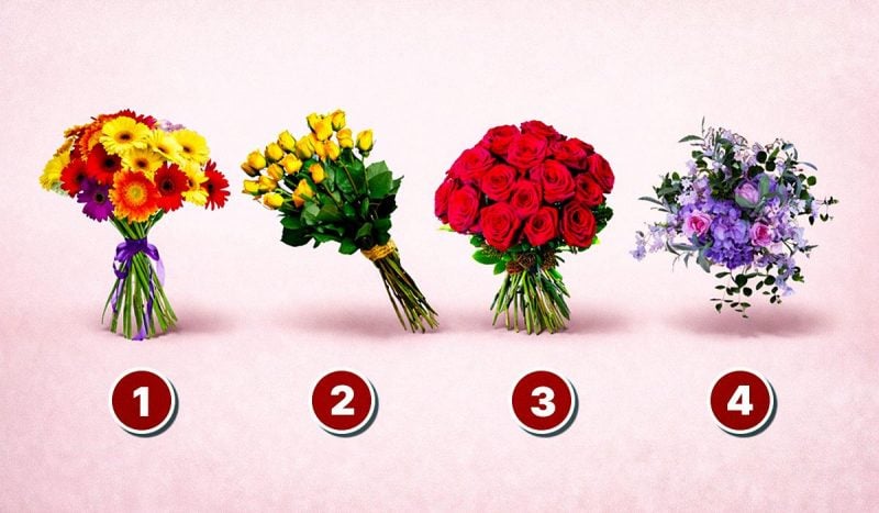 На иллюстрации показаны четыре разных букета, среди которых вам нужно выбрать лишь один. Подумайте, какую из этих цветочных композиций вам прямо сейчас хотелось бы получить в подарок. Не размышляйте над ответом очень долго, иначе он не будет искренним. Помните, что результат теста отражает лишь ваше нынешнее психологическое состояние, и через некоторое время выбор может измениться.