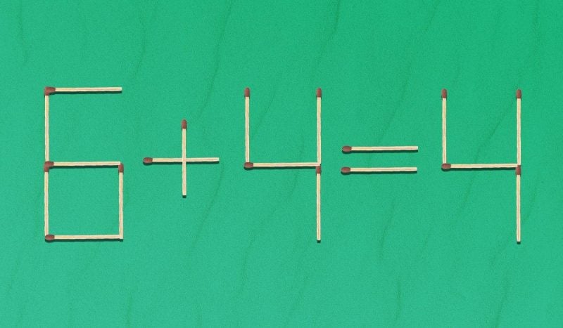 На изображении с помощью спичек выложен пример 6+4=4, который является ложным. Чтобы его исправить, можно передвигать лишь одну палочку. Вам нельзя разрушать или перечеркивать знак "равно", но разрешено менять любые другие цифры и символы.