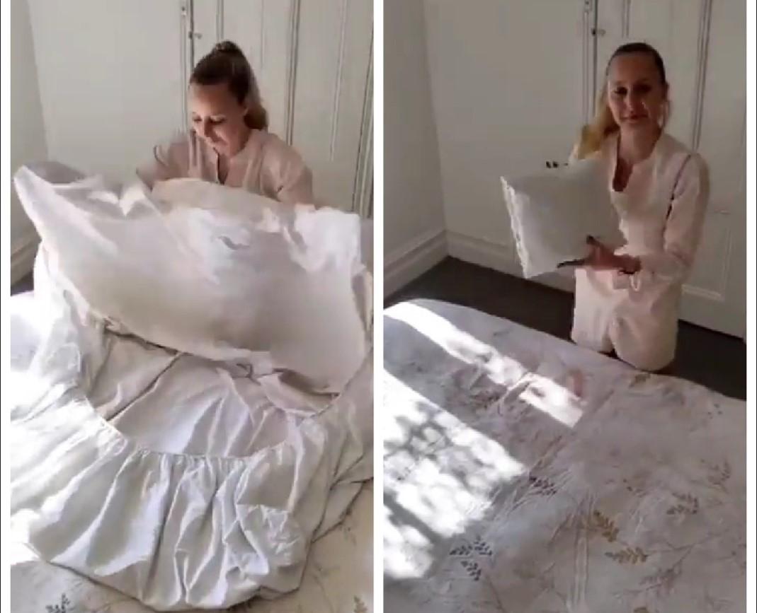 Женщина показал на видео очень эффективный метод складывания постельного белья. Сначала она поднимает два нижних угла простыни. Затем она заправила нижние углы внутрь верхних углов.