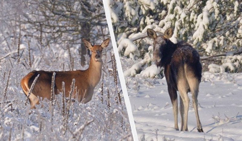 В Чернобыльском радиационно-экологическом биосферном заповеднике зафиксировали в заснеженном лесу лося и оленей. О животных рассказали в заповеднике и обнародовали соответствующие фото.