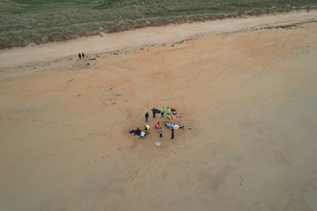 На пляже во Фрейзербурге, Шотландия, двое дельфинов застряли на песке и не могли вернуться в море. В зоне отдыха развернули спасательную операцию, поскольку транспортировать водных млекопитающих, вес которых может достигать сотен килограммов, в воду оказалось непростой задачей.