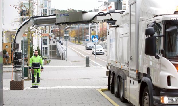 Отдельная тема - это мусор - мусоросборочный автомобиль в Хаммарби высасывает мусор из подземного трубопровода, по которому отходы от домов транспортируются к центральной улице.
