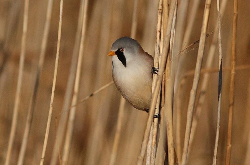 "По этим ярким усам видно, что это усатая синица (Panurus biarmicus) - аборигенный вид птиц, который живет постоянно на одном месте в Национальном природном парке "Тузловские лиманы". Их можно слышать в камышах Тузловской Амазонии каждый сезон и даже сейчас - в новогодние праздники. Конечно, они страдают от шумов войны, как и многие другие виды..." - констатировал исследователь.