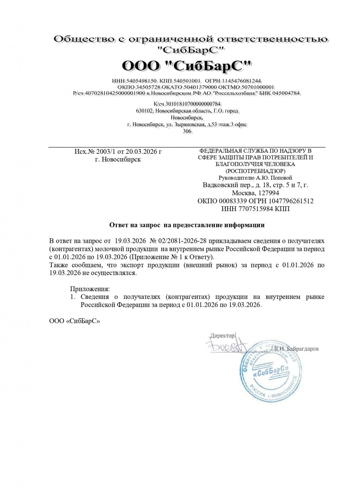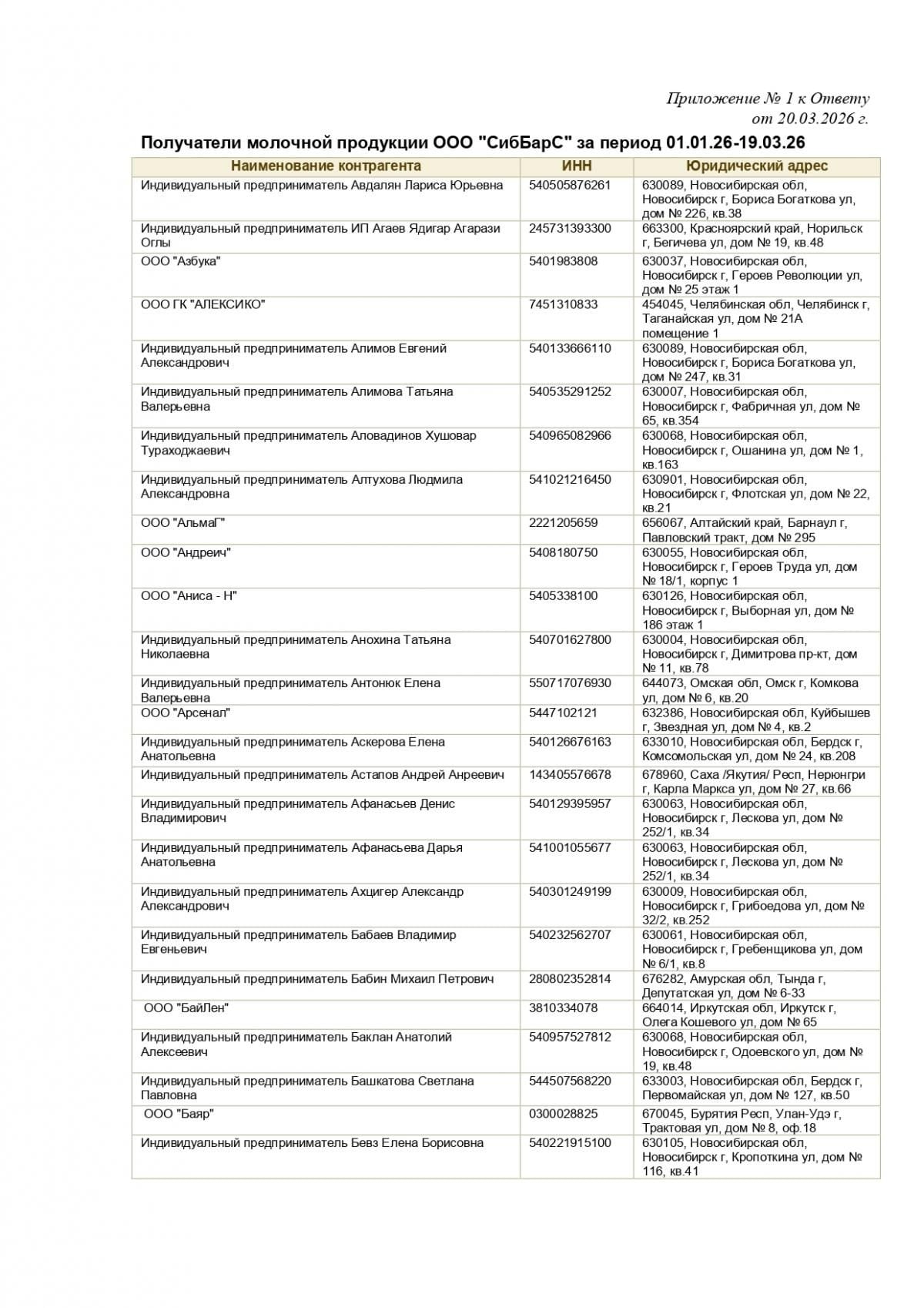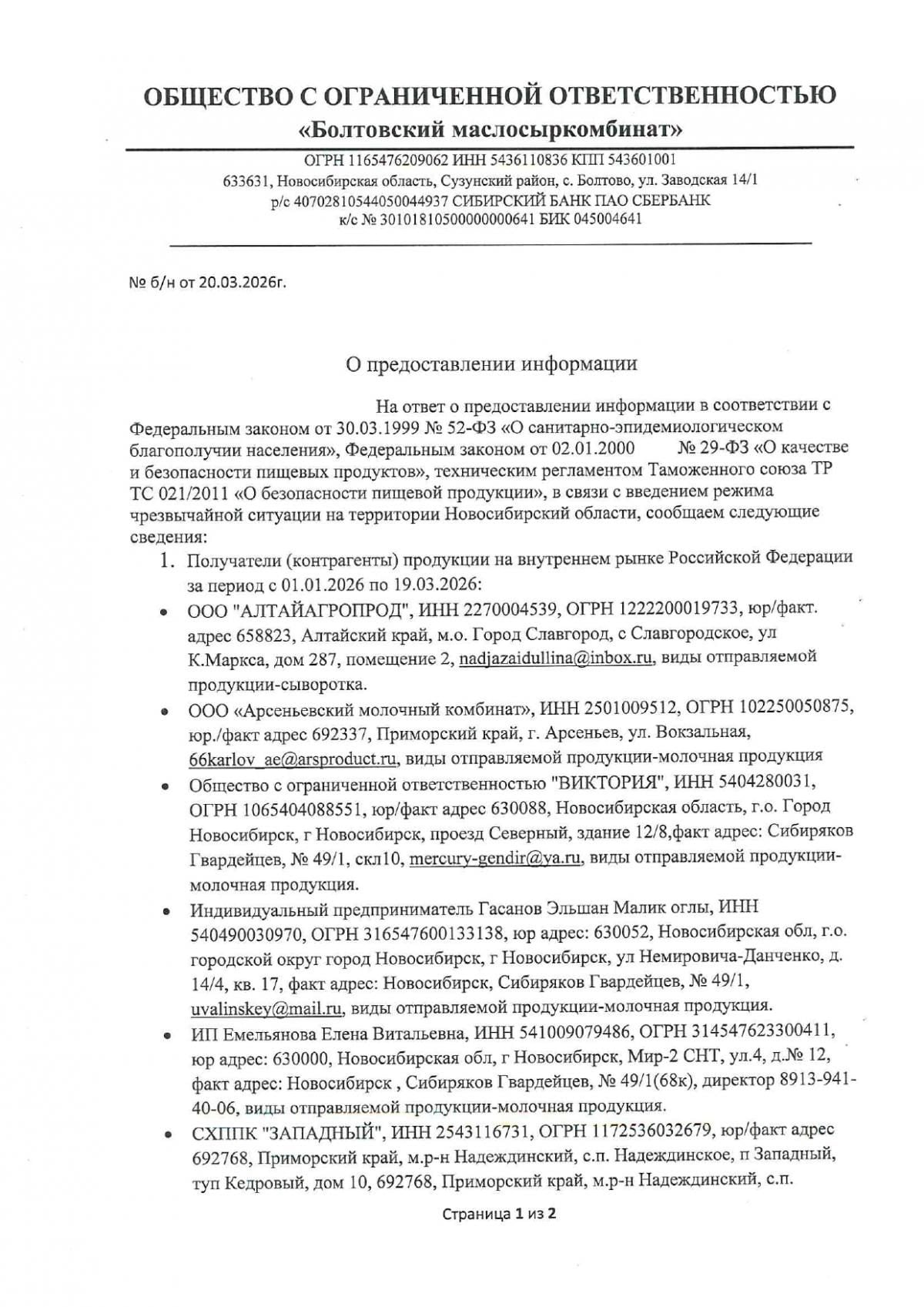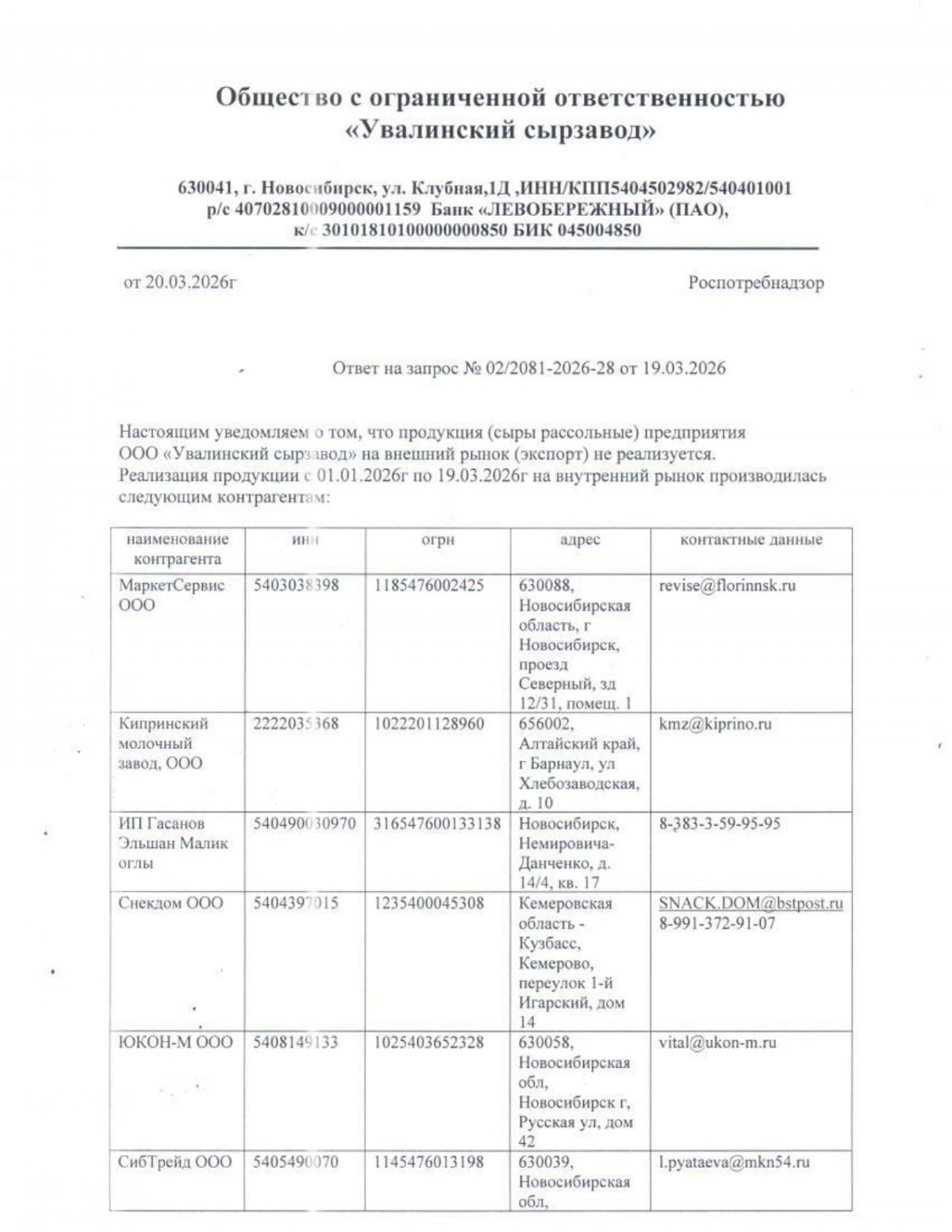 Так, "Увалинский сырзавод", расположенный в Новосибирске, за период с 1 января по 19 марта 2026 года осуществил отгрузки ряду компаний и частным предпринимателям в Новосибирской, Кемеровской, Томской, Омской, Амурской, Иркутской областях, а также в Алтайском и Забайкальском краях.