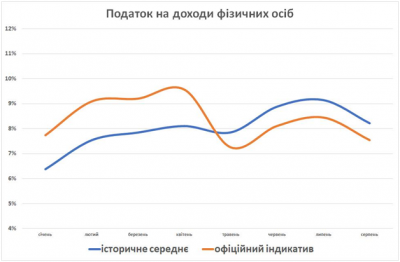 «График ниже – это история победы, например, для одного из налогов (НДФЛ). Оранжевая линия – план сбора налога, правительство само себе выставляет на каждый месяц, так называемые помесячные индикативы. Синяя линия – это историческое среднее этих поступлений, то есть сколько фактически собиралось в этот месяц в предыдущие годы (с учетом инфляции). Интересно, что помесячные индикативы для первых четырех месяцев выставлены на уровне, более высоком от исторического. Индикативы для мая-августа – наоборот, непривычно низкие», – отмечает эксперт.