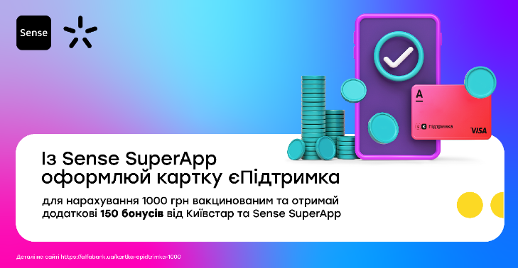 Киевстар вместе с Альфа-Банком будут начислять дополнительные 150 бонусных гривен всем новым клиентам Sense SuperApp, кто оформит специальную карту єПідтримка для получения 1000 грн в рамках государственной программы поддержки вакцинированных.