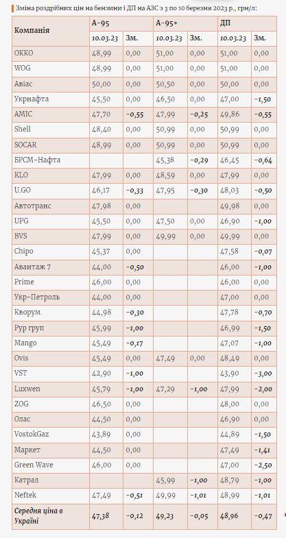 Отмечается, что с 3 по 10 марта бензин в среднем потерял в цене 5-12 копеек, до 47,38-49,23 грн/л, а дизельное топливо - 47 копеек, до 48,96 грн/л.