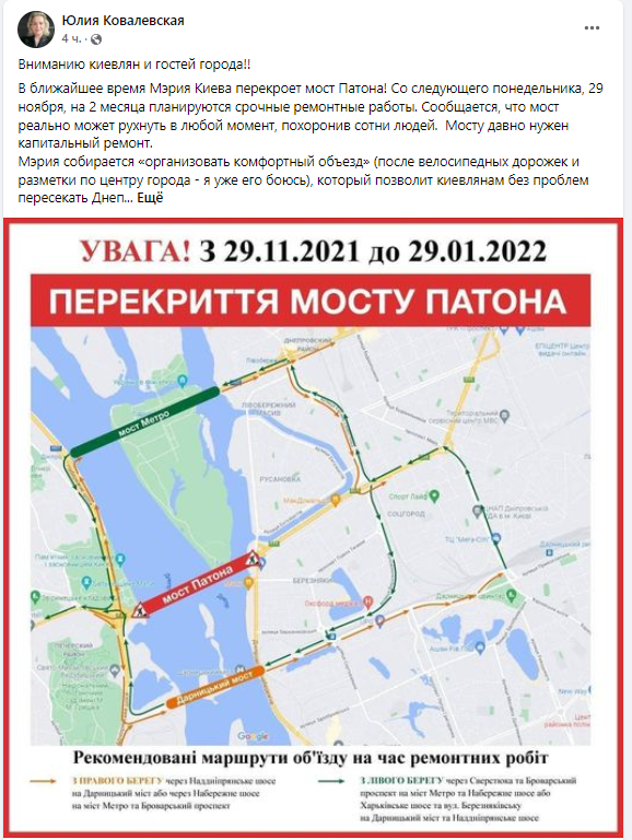 Сегодня депутат Харьковского облсовета Юлия Ковалевская на своей странице в Facebook сообщила, что в ближайшее время мэрия Киева перекроет мост имени Патона для срочных ремонтных работ.