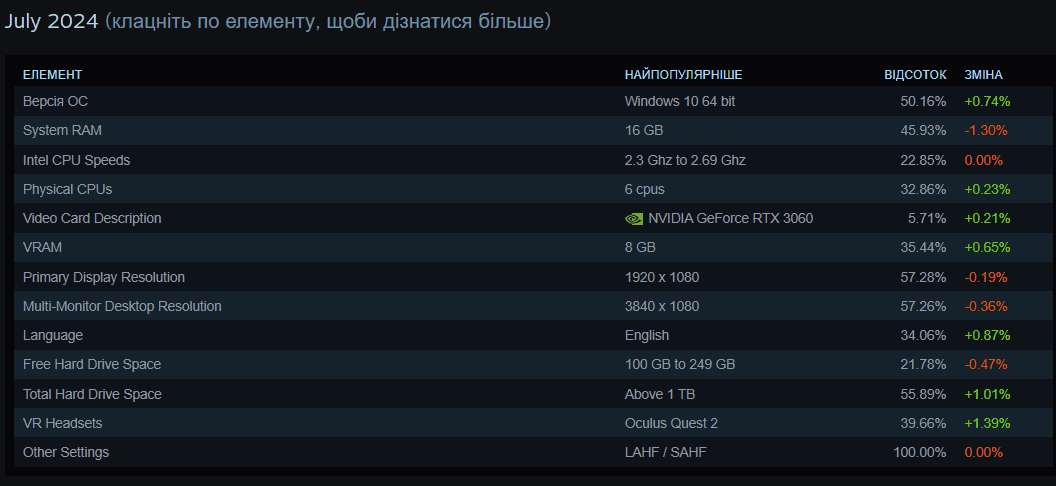 В целом, самая распространенная игровая ПК-сборка в 2024 году включает в себя 6-ядерный процессор с частотой 2,3-2,69 ГГц, видеокарту GeForce RTX 3060, 16 ГБ ОЗУ, минимум 1 ТБ накопителя и монитор разрешением 1080р. А Windows 10 по-прежнему самая популярная операционная система.