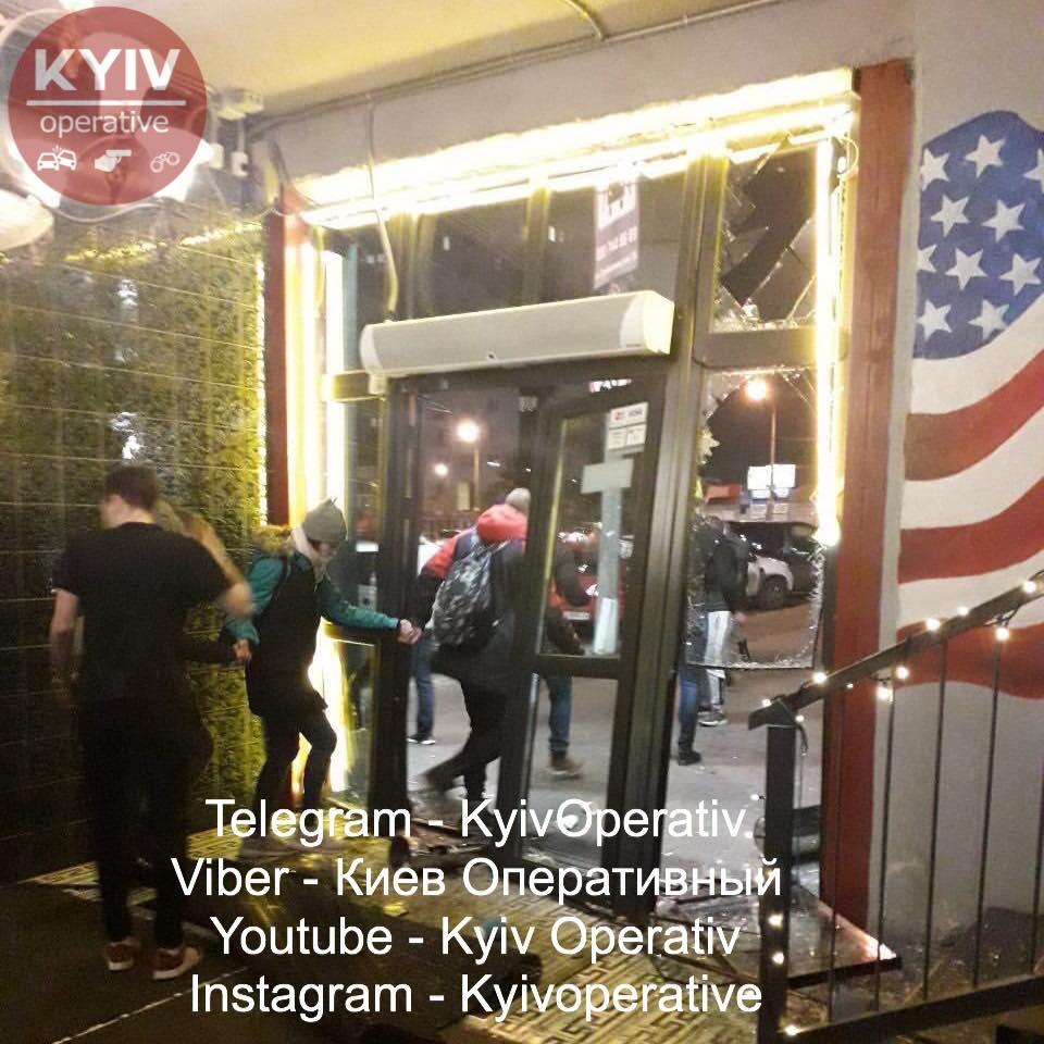 В Киеве на Позняках группа молодчиков устроила массовую драку в пиццерии MisterCat, а впоследствии разнесла автомобилем входные двери заведения.