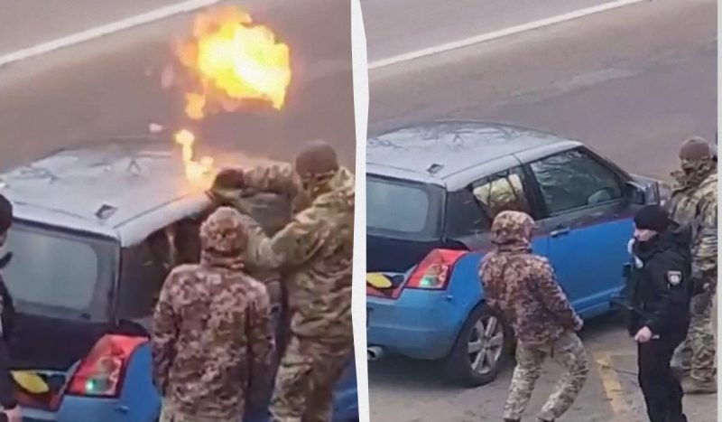 Тг-каналы публикуют видео, на котором полицейский "задувает" салон авто газом из баллончика, после чего человек в военной форме (предположительно, работник ТЦК) поджигает его, вероятно, чтобы "выкурить" из машины военнообязанного. Утверждается, что кадры сняты в районе Вышгорода Киевской области.
