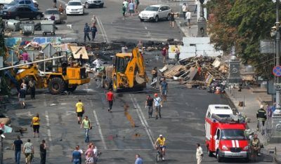 Как передает корреспондент УНИАН, автомобили двигаются по Крещатику и прилегающим улицам, кроме улицы Институтской, где еще не разобраны баррикады.