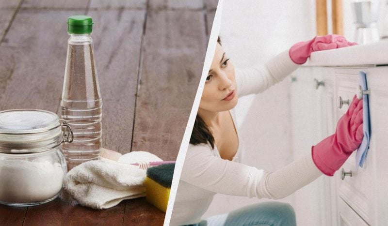 Нужно смешать уксус с водой в равных пропорциях и использовать эту жидкость для протирания шкафов. Кислота в уксусе растворяет молекулы жира и грязи. Она также поможет нейтрализовать запахи, оставляя на кухне ощущение свежести и чистоты.