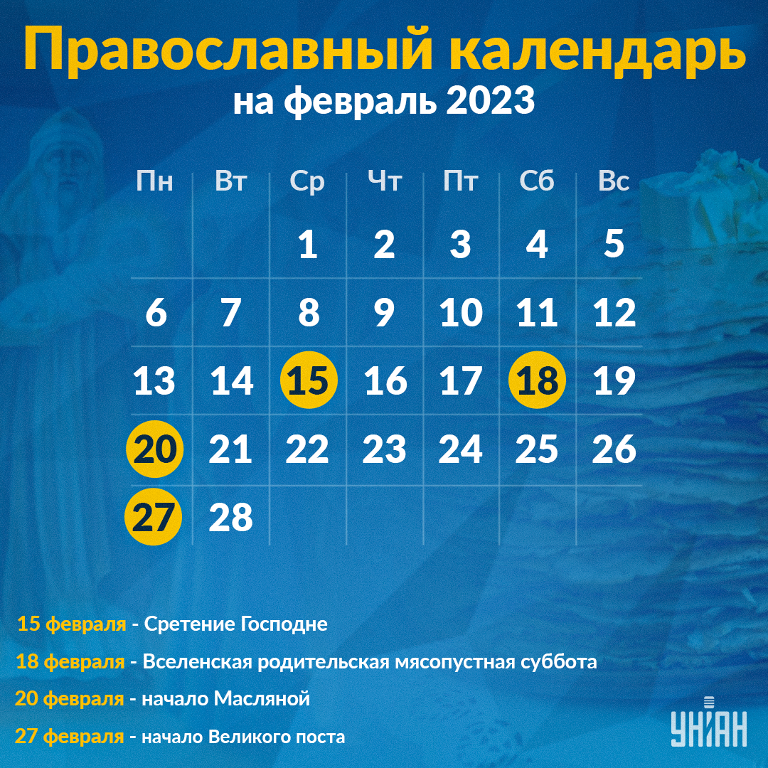 В феврале православные верующие отмечают несколько религиозных событий. Среди важных церковных праздников - Сретение Господне (15 февраля). Также в последнем месяце зимы будет Поминальная родительская суббота (18 февраля) и начнётся Великий пост (27 февраля). Более подробный православный календарь с праздниками - читайте в материале УНИАН.