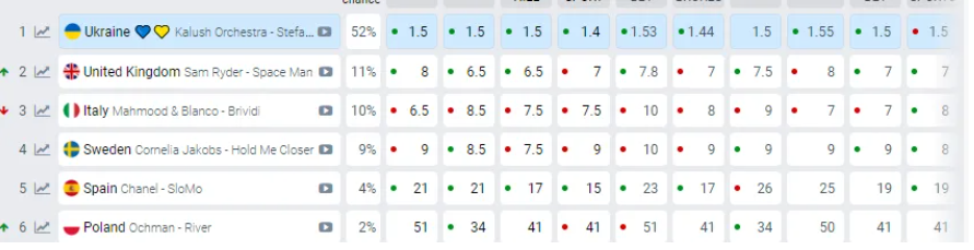 Кроме того, букмекеры прогнозируют Украине победу с вероятностью 52%. Хотя еще до первого полуфинала на Kalush Orchestra ставили только 42%.