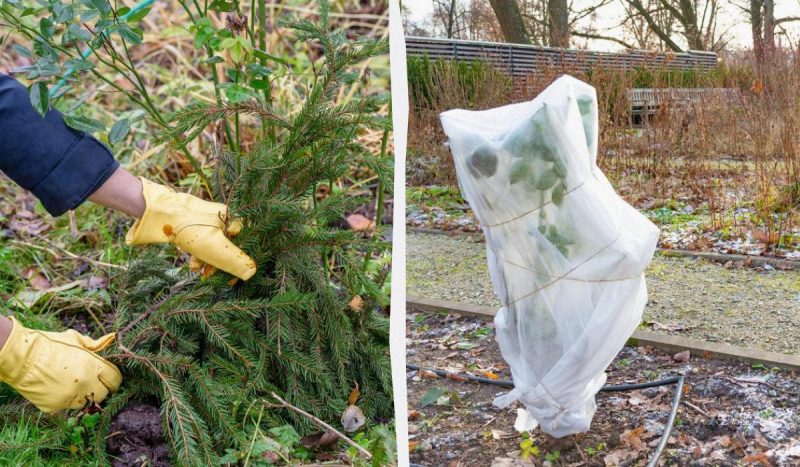 Если куст одревеснел - его гнуть опасно. В этом случае нужно обернуть рулоном из сетки или рубероида, а внутрь насыпать сухие листья, хвою или опилки. Сверху надеть мешок и привязать бечевкой для того, чтобы внутрь не попадала вода.