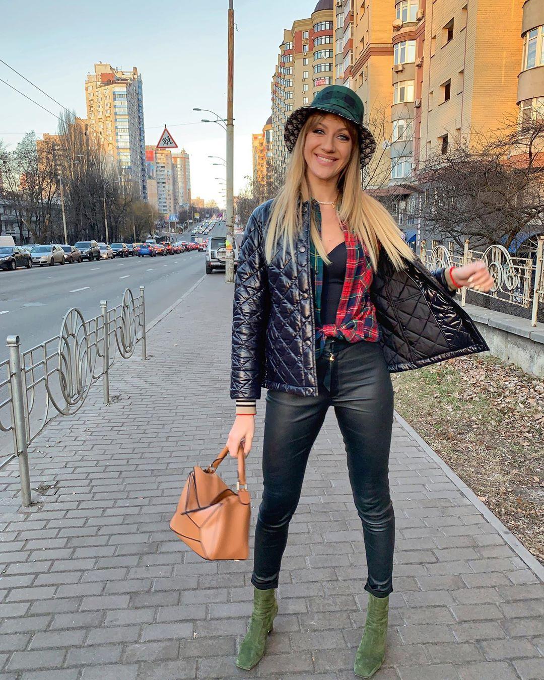 На опубликованном в Instagram снимке телезвезда позировала в черном боди, клетчатой рубашке, куртке и кожаных штанах. Дополнила образ Никитюк яркими ботильонами и зеленой шляпкой.