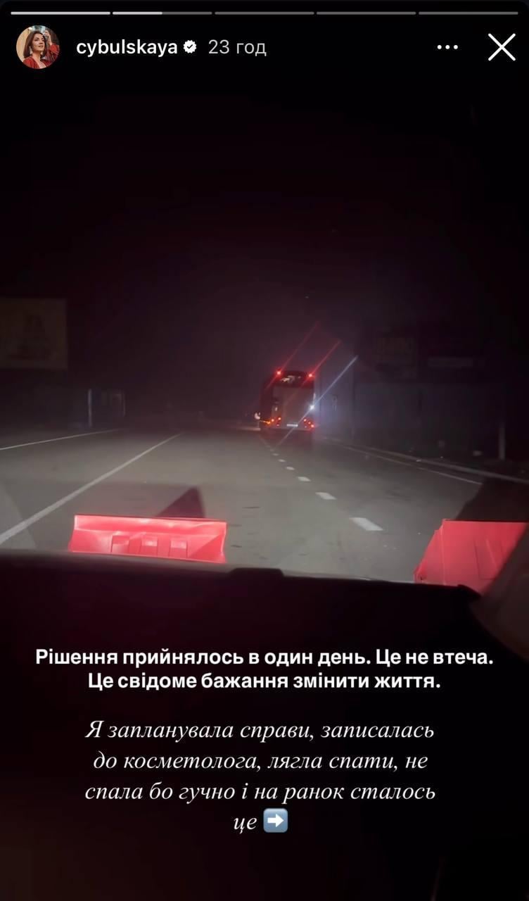 "Я уехала из Украины. Решение принялось в один день. Это не побег. Это сознательное желание изменить жизнь. Я запланировала дела, записалась к косметологу, легла спать, не спала, потому что громко, и на утро произошло это", - написала Цибульская.