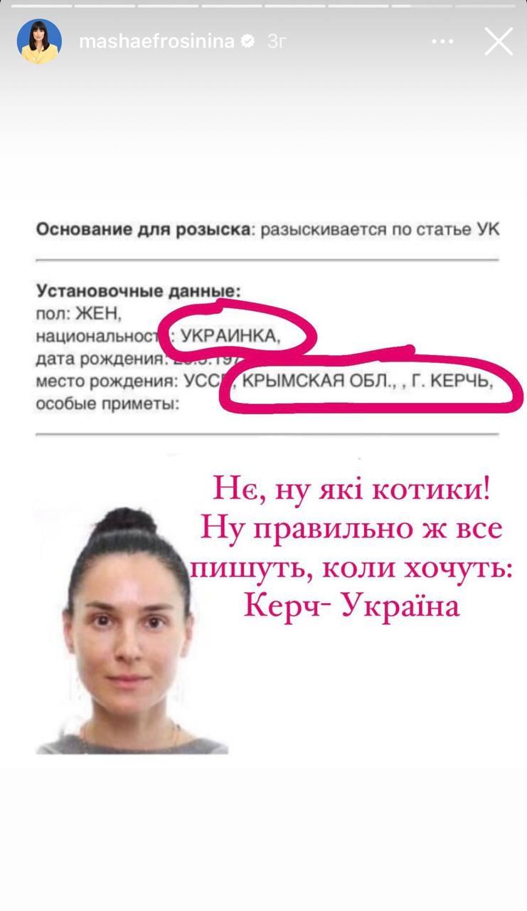 Впоследствии она обратила внимание на то, что в персональной карточке в реестре террористов и экстремистов указано, что Ефросинина - украинка, которая родилась в Керчи (Крым). Так что россияне сами признали, что Крым - это Украина.