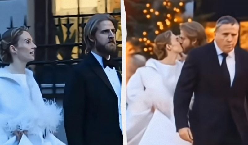 Для особого дня невеста выбрала белое свадебное платье, дополненное объемным пушистым пальто, а Гатсон появился в классическом смокинге. Образ Умы Турман состоял из нежно-голубого платья, а Итан Хоук предпочел черный total look.