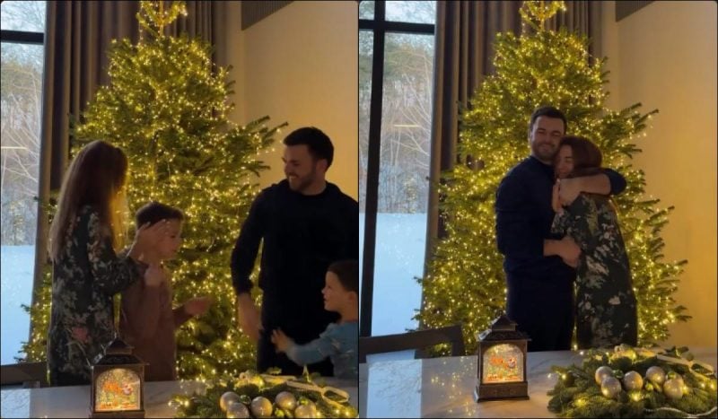 На обнародованном ролике все семейство покрасовалось на фоне украшенной новогодней елки.