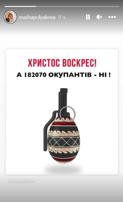 "Христос Воскрес! Со светлым праздником Пасхи! Пусть ангел-хранитель оберегает вас от всех невзгод. Мысли пусть будут светлыми, а счастье в дом приходит с каждым новым рассветом. Мира вашему дому, победы нашей Украине!" - впоследствии написала Никитюк.