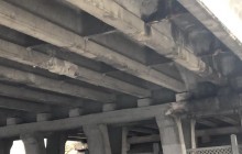 В Киеве грузовик с гусеничным краном зацепил путепровод