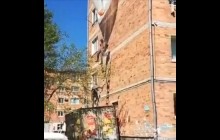 В России боец ВДВ зацепился за крюк и повис в торце дома (видео)