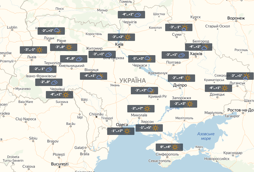 В понедельник в Украине без осадков. На юге до +7°, в остальных регионах до -1°...+4°.