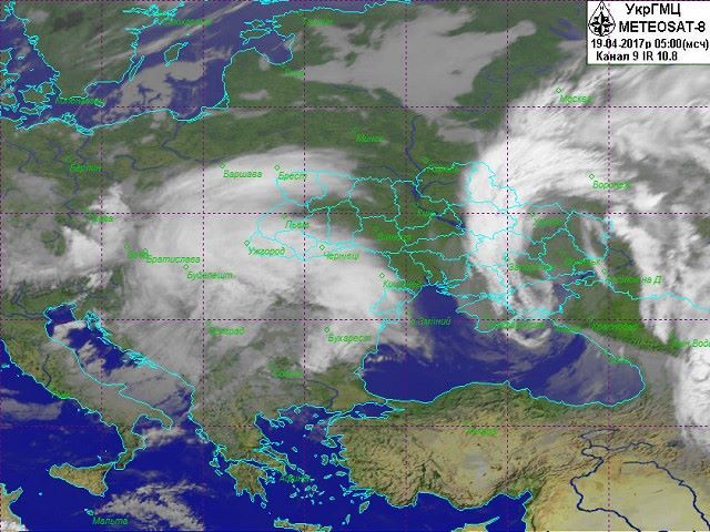 "Украина между двумя циклонами. Спутниковые снимки в видимом и инфракрасном спектрах", - говорится в сообщении синоптиков, в котором добавляются карты движения циклонов.