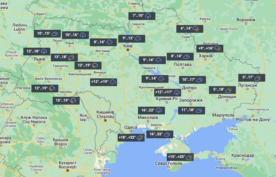 В конце недели, 11 сентября, дожди накроют уже практически всю Украину. Преимущественно сухая погода ожидается лишь в Луганской и Донецкой областях, а также в Крыму. День будет довольно прохладным. На западе столбики термометров покажут +12°...+19°, на севере +11°...+17°, в центральных областях ожидается от +14° до +18°, на востоке будет от +13° на Харьковщине до +20° в Донецкой области, лишь на юге воздух днем прогреется до +17°...+24°.