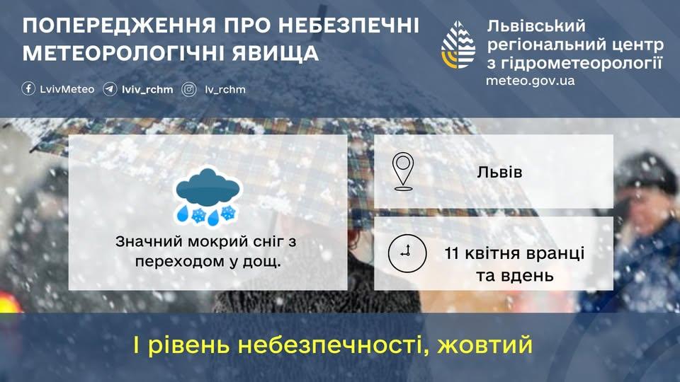 "По городу Львову в ближайший час с сохранением днем 11 апреля значительный мокрый снег с переходом в дождь", - прогнозируют синоптики.