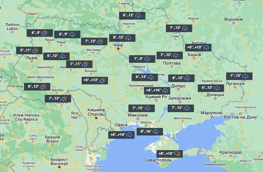 Столбики термометров в большинстве областей покажут +11°...+13°, а на Прикарпатье и в Закарпатье воздух прогреется до +14°...+16°.