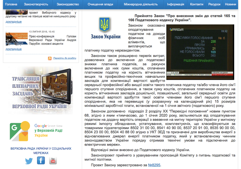 Сайт Верховной Рады опубликовал новость о принятии поправки, которая позволила бы ДТЭК Рината Ахметова не платить более 3 миллиардов гривень налогов. На самом деле поправка принята не была - за нее проголосовали 155 депутатов из необходимых 226.