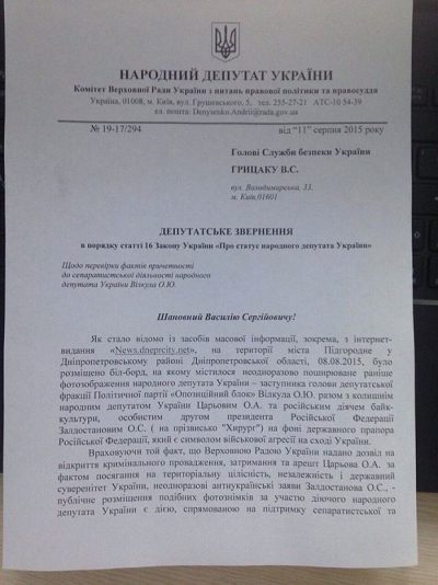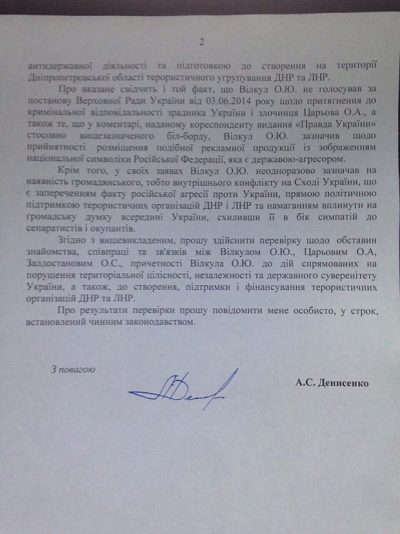 Об этом Денисенко написал на свой странице в Фесбук, добавив к сообщению скан своего обращения к СБУ.