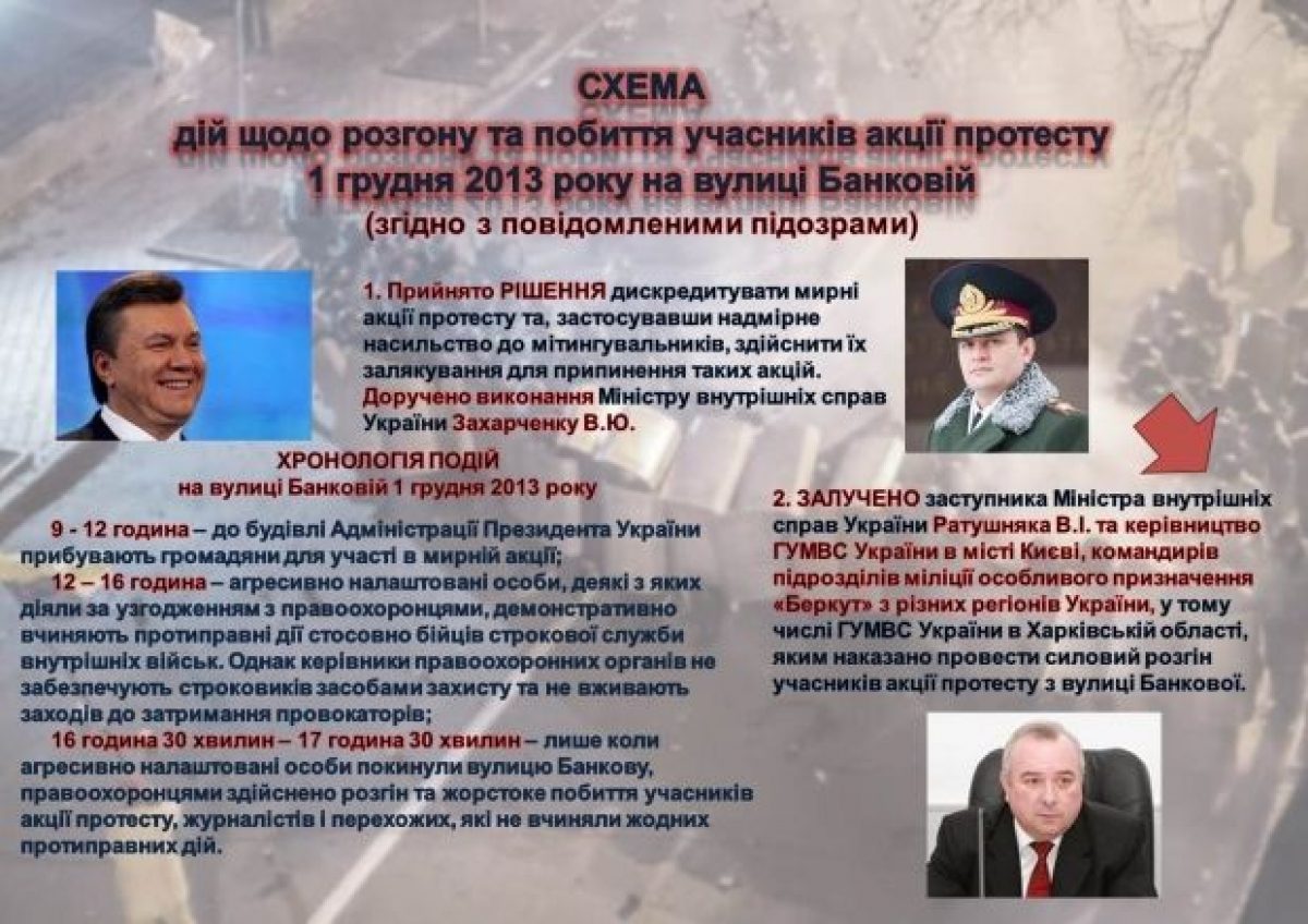 По фактам событий 1 декабря 2013 года на улице Банковой сообщено о подозрении бывшим президенту Януковичу, руководству МВД Украины (Захарченко, Ратушняку), руководству Главного управления МВД Украины в городе Киеве (Федчуку), внутренних войск, а также бывшему командиру одного из территориальных батальонов "Беркута", который содержится под стражей.