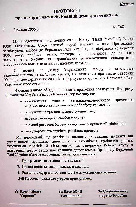 Принятый проект протокола (полный текст смотрите ниже) предусматривает, что три силы создают "коалицию демократических сил" для реализации "программы президента Виктора Ющенко".