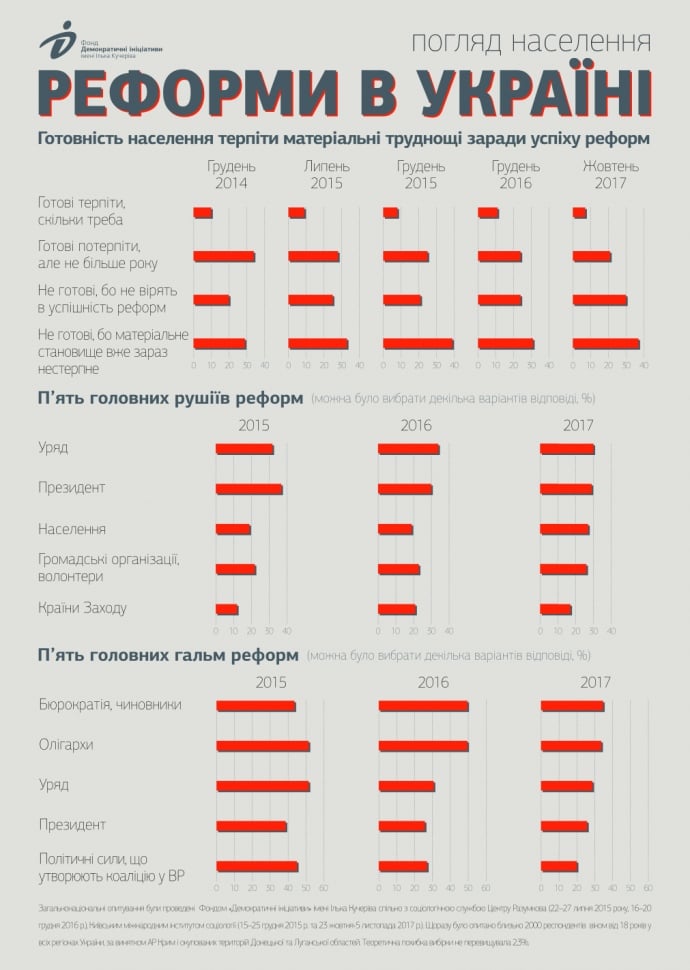 Исследование проводилось Фондом «Демократические инициативы» им. И. Кучерива совместно с Киевским международным институтом социологии с 23 октября по 5 ноября 2017 года. Было опрошено 1614 респондентов в возрасте от 18 лет во всех регионах Украины, за исключением АР Крым и ОРДЛО. Теоретическая погрешность выборки не превышает 2,6%.