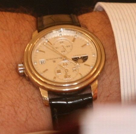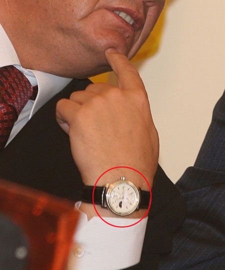 Однако и премьерская рука украшена не дешевой безделушкой. Его часы – всемирно известной швейцарской фирмы "Blancpain". Принадлежат к коллекции "Leman", имеют два циферблата и наделены дополнительной функцией GMT (Greenwich Mean Time), благодаря которой показывают своему владельцу время в любой точке мира. С браслетом из крокодиловой кожи.