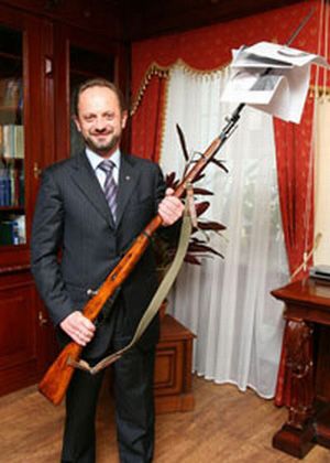 Информационный департамент и пресс-служба "Нашей Украины", сообщает TabloID, подарили шефу винтовку Мосина, которую использовали с 1891 года, и которая была основным оружием революции 1917 года. По словам руководителя департамента Татьяны Мокриди, оружие приобрели со всеми разрешениями, но оно не предназначено для использования.